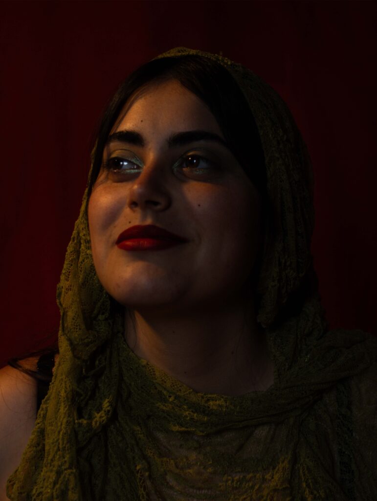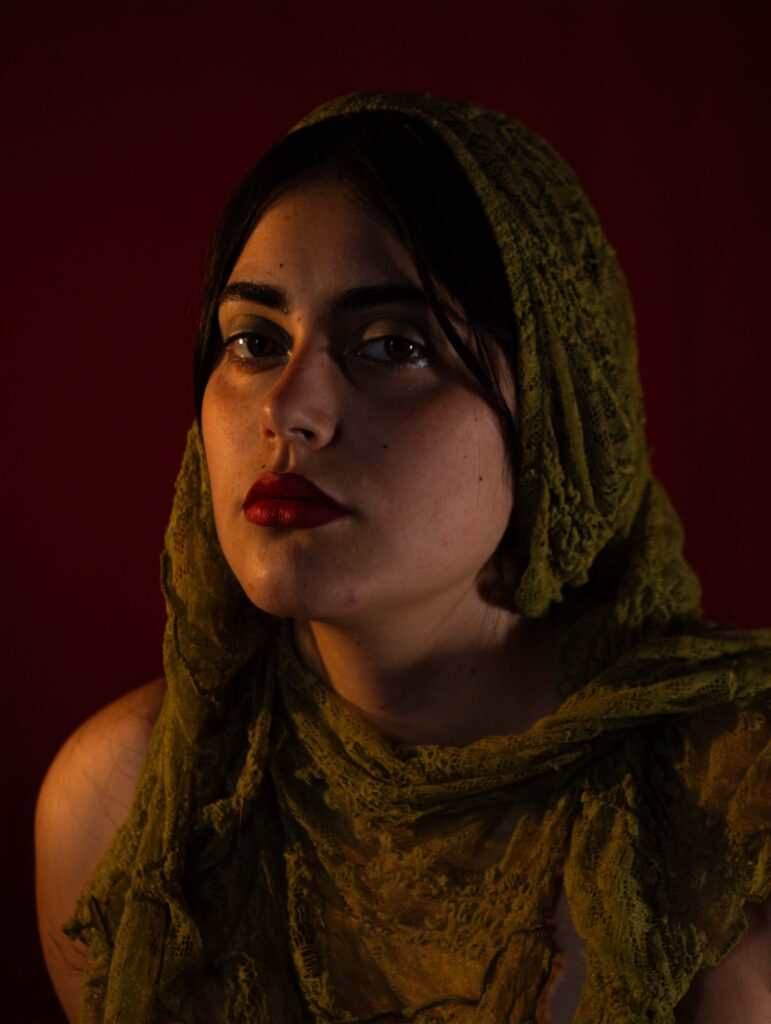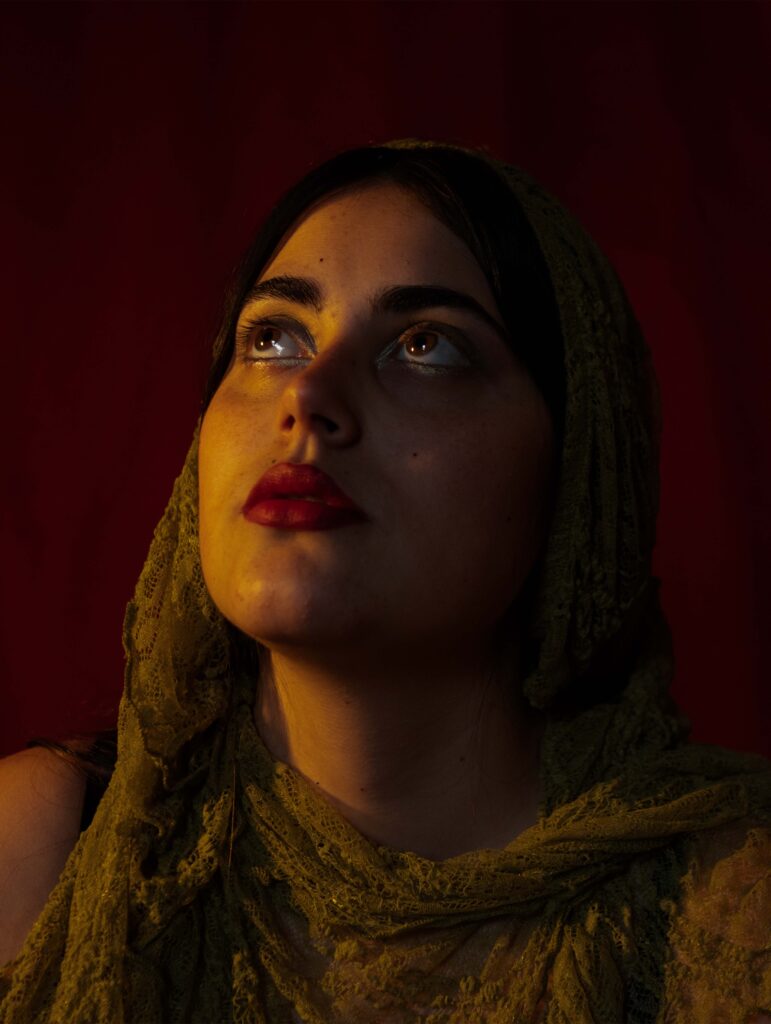 Exploring the interplay of color, light, and texture to evoke a mood of quiet strength and mystery. The rich burgundy backdrop adds depth and emotional intensity, enhancing the warmth and drama of the scene. She is adorned with a green lace veil that drapes over her head and shoulders. The choice of green against burgundy creates a natural tension, symbolizing renewal against passion, serenity against intensity. Shot with a focus on warmth, contrast, and intentional softness, the image invites the viewer into a quiet, powerful stillness amidst elemental tones.